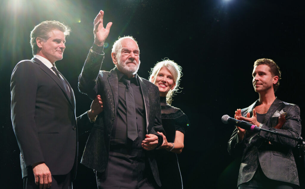 Inspirational Lifetime Achievement Award honoree Neil Diamond (center) with son, Jesse (left) and wife Katie, acknowledges the cheering crowd along with Nick Fradiani (right), star of “A Beautiful Noise–The Neil Diamond Musical.” The 39th Annual Carousel Ball, hosted by the Children’s Diabetes Foundation, benefiting the Barbara Davis Center for Childhood Diabetes, at the Hyatt Regency Denver at Colorado Convention Center in Denver, Colorado, on Saturday, Oct. 11, 2025. STEVE PETERSON