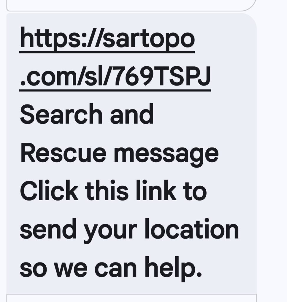 Greg Foley from Grand County Search and Rescue says, “One of the first things our team is going to do is send you what’s called an SMS locator by text. It will be a text message from a number you don’t recognize that looks something like this: