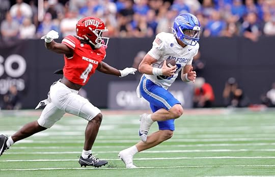 Air Force running back Owen Allen (2) gets past UNLV defensive back Jake Pope (7) and runs for a touchdown during the first half of an NCAA football game Saturday, Oct. 11, 2025, in Las Vegas. (Steve Marcus/Las Vegas Sun via AP)Also, the nature of a series of shootout games and second-half deficits has demanded the passing game be used more frequently.