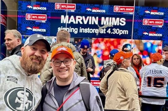 Stephen Reenie and Gordon McWhinnie, right, traveled from Scotland to meet receiver Marvin Mims on Friday and watch Denver beat the New York Jets 13-11 Sunday in London. (Mark Kiszla/The Denver Gazette)We have proof that Broncos Country now extends halfway around the globe to Loch Lomond, whose tranquil waters McWhinnie left behind, taking both high and low roads to London, as a devoted pilgrim wearing orange and blue.