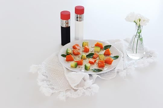 Aromatizza l’olio con foglie di menta freschissima se ti piace l’idea. Taglia tutti gli ingredienti e lasciali marinare nell’olio e nel succo e anche nella scorza se non è trattata. Basterà grattugiarne giusto un po’. Aggiusta di sale e pepe se piace. Adopera un coppapasta se ti piace la presentazione a torretta, come in foto. Bon. Finito.