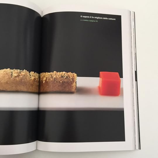 Il libro è edito da Red Edizioni (ormai che ho cominciato vorrei parlare di tutto quelli che possiedo perché meritano davvero una menzione d’onore) e costa 77 euro, essendo come tutta la produzione di fascia alta. Un prezzo per nulla esagerato contestualizzato a quello che contiene. Le foto splendide sono di Giovanni Panarotto. Hanno le linee orientali e il pragmatismo visivo nipponico. I cubi di Kitchen, che è una composizione di cubi (ben 12), ricorda Mirò e Kandinskij. Sfogliarlo è un po’ come andare al Louvre: che ti pare quasi di scorgere la grandezza e la magnificenza della Gioconda dietro il risotto con barbabietola e fungo shiitake arrostito allo zenzero. Già leggere solo i 12 cubi vale la pena di possederlo. Cubo di pane con pesto di basilico e fontina di montagna. Cubo di pesto di rape con spuma di gorgonzola e contrasto di balsamico. Cubo di patate bollite e schiacciate con timo e olio d’oliva con patè di ceci rotolato in mandorle tritate. Cubo di pesto di zucca con panissa fritta e cubo con pesto di avocado e verdure con chiffonade di crudità. E tanti di quei cubi come se fossi finito dentro a Rubik.