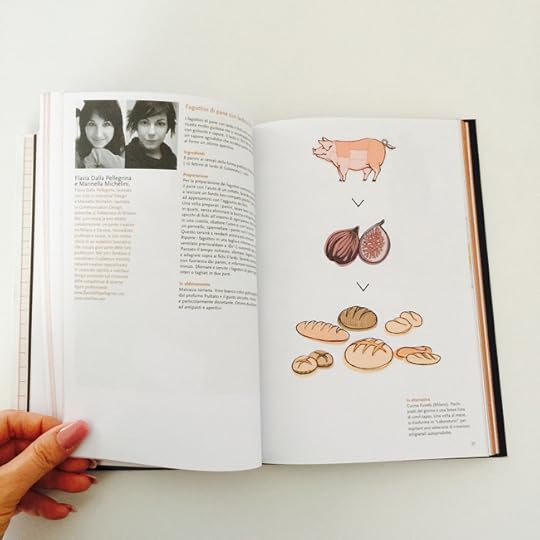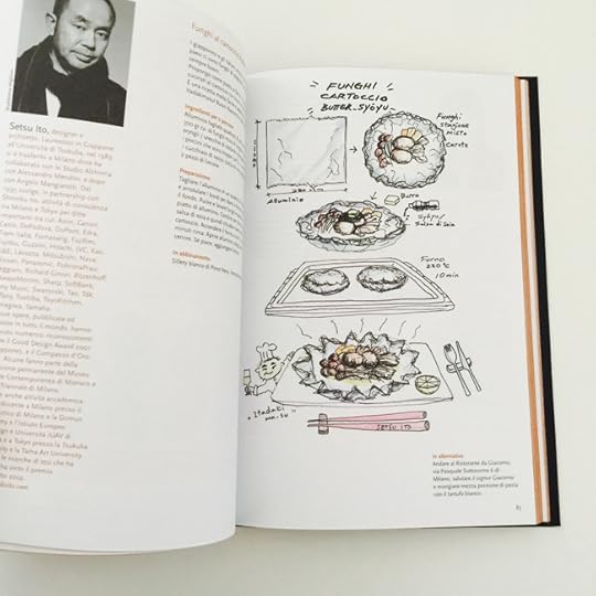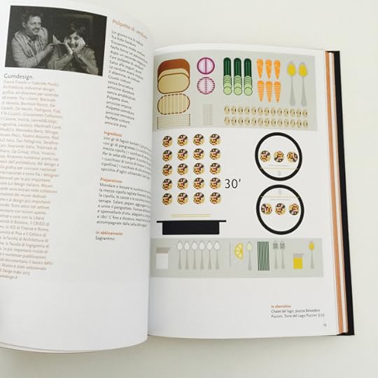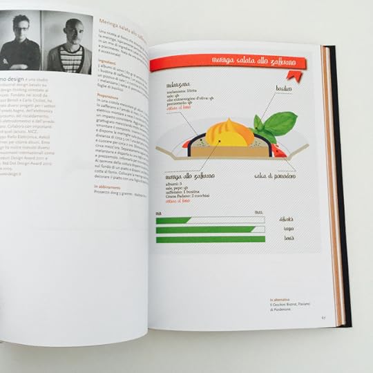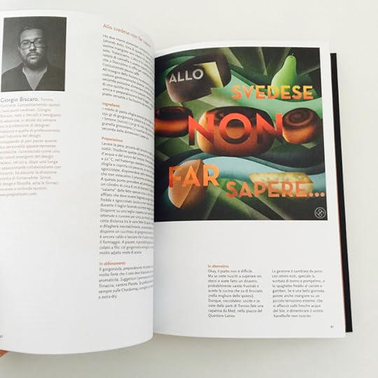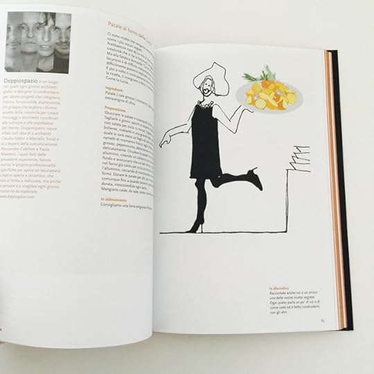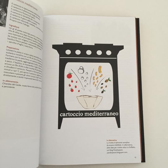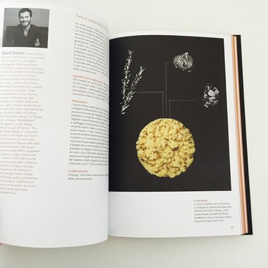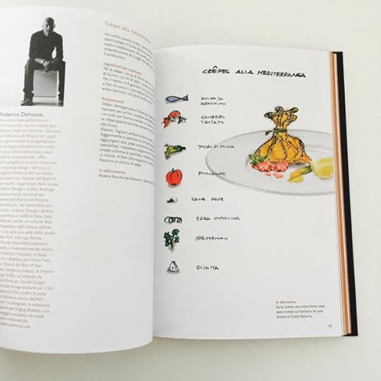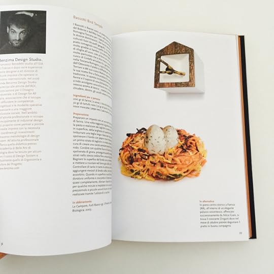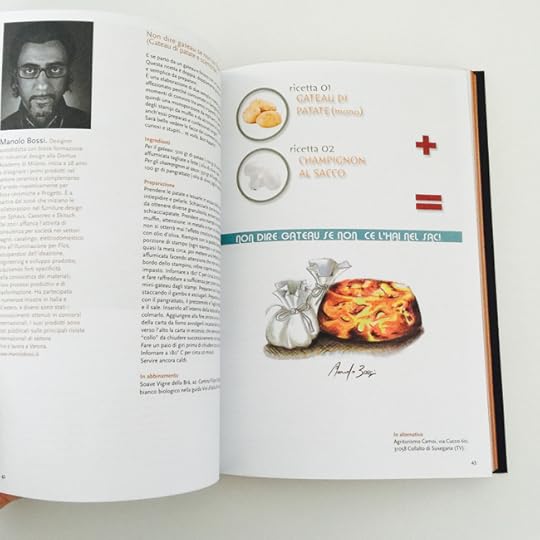 Foto del Design/Architetto e mini biografia seguita da piccola introduzione sul perché e sul per come la ricerca sia ricaduta sulla determinata ricetta. Ingredienti e spiegazione e infine abbinamento del vino. A seguire a tutta pagina la foto della ricetta, che non è sempre una foto ma pure un disegno-schizzo-composizione grafica e qualche alternativa o consigli se capita. La carta non è lucida ma rugosa e fibrosa e la fotografia generale dell’opera non ha colori accecanti e neanche molto enfatizzati, anzi l’opposto. Dal gusto un po’ aranciato, giallognolo e poco patinato. Anzi. Pochissimo. Perché ci si aspetterebbe per certi versi una cura diversa. Un’esposizione maggiore, sì. E invece il bello sta proprio nella naturalità e non nella sovraesposizione sia di arte che di pensiero che di fotografia stessa. Le ricette sono molto interessanti e ce ne sono alcune che pur essendo semplici rappresentano delle vere e proprie chicche. Certo non è il momento ideale per parlottare di un libro pieno zeppo di ricette da fare al forno, contando che ticchetto a inizio estate, ma può sempre tornar utile, no? Del resto fa così caldo che due spaghetti allo scoglio dentro il cartoccio sul parabrezza della macchina li possiamo pure trovare belli che pronti al ritorno dal lavoro, no? Mangiarli comodamente lì e ripartire più carichi (di sudore) di prima. Favoloso!