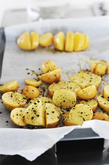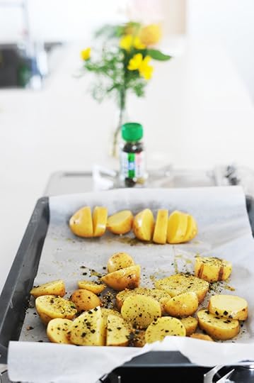 Poggia le patate su carta da forno e condiscile. In una piccola ciotolina mischia un po’ di salsa di soia e olio (se hai il wasabi in crema e non in polvere eventualmente aggiungilo adesso) e insaporisci. Ma anche solo la salsa di soia andr�� bene. Cuoci in forno e poi ne riparliamo, ok?