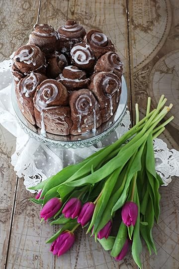 Ho visto questa ricetta sul libro di Csaba Dalla Zorza “Cioccolato”; di cui vorrei parlarti presto all’interno della Libreria di Iaia. In realtà vorrei fare proprio una raccolta di tutti i suoi libri come ho fatto con Jamie Oliver. La ricetta, racconta l’autrice, le è stata regalata da una collega tedesca in occasione del Salone del Mobile di Milano ma in versione bianca. Con il tempo Csaba l’ha modificata fino a renderla così: al gusto di cacao. Non so cosa sia successo, te lo dico chiaramente senza girarci intorno, ma a me i cinnamon roll sono lievitati in modo abnorme formando una sorta di torta. Ho seguito scrupolosamente le istruzioni e usato la quantità di lievito indicata. I tempi? Quelli scritti, indi per cui non capisco. Il risultato visivo è strepitoso e anche il gusto, nonostante non ricordino i classici cinnamon roll, è davvero buono. Qualora la provassi fammi sapere – se hai voglia – se anche a te hanno lievitato così tanto, mi farebbe piacere. Mi sono ripromessa di riprovarli, comunque, al più presto perché la cosa mi ha incuriosito parecchio.Perfetti, questi cinnamon roll, per un tè speciale. Di quelli speziati. A tal proposito mi viene in mente un fumante chai che lascia in bocca quel sapore di pepe e zucchero che tanto mi piace.