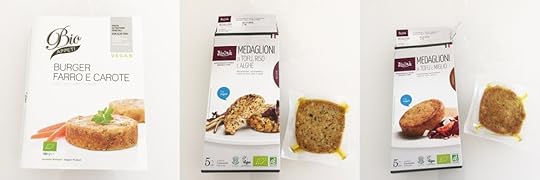 Oggi ticchetterò riguardo Burger di farro e carote (i miei preferiti tra i tre), Medaglioni di Tofu e riso e alghe (che si aggiudicano il secondo posto) e Medaglioni di tofu e miglio.