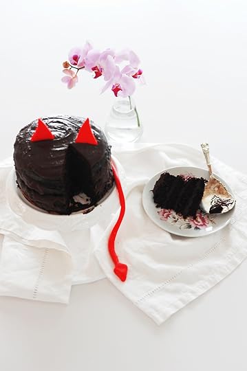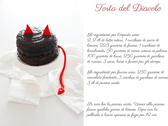 Ho voluto cominciare con la Torta del Diavolo. Poteva non essere di cioccolato? L’ho trovata in un vecchio libro. Un mappazzone abnorme di cioccolato. Due strati che diventano quattro spazi da riempire con altrettanto cioccolato. Uno di quei grattacieli nauseabondi che non lo sono affatto per gli amanti vogliosi e instancabili dell’oro nero. Bastano due quadratini di pasta di zucchero rossa a completare l’opera rendendo così diabolico, non solo caloricamente parlando, il tutto.