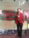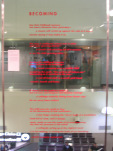 A heady feeling having my poem displayed in this context, adhesive red vinyl letters applied to the thick glass walls overlooking the security area. As I recall, my poem was positioned next to one by Colette Inez, another former resident at the colony, as a dear friend. In a way, it was a bit like being in an Ashbery poem.