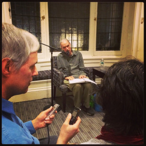 David Simpson reading at NYU CEnter for Creative Writing in December 2014, while his brother Dan records.