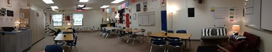 Over the years, I have added new pieces to my classroom space – a bench here, some pillows, a stool, a couch there – to accommodate the needs of my learners. My classroom now features a variety of different spaces. There is a reading nook with a couple of couches, pillows, a rug, and chair situated next to my bookshelves for a comfortable place to read. There are two desks facing one another near my back window, a perfect spot for a one-on-one conference. My teacher’s desk, a hacked Ikea bookcase on casters, is at the back of the room without a chair. It is a counter to hold my computer and teaching materials and to host informal conversations, but I don’t spend much time there, so there is no need for a chair. I have a combination of tables and chairs, traditional desks, comfortable benches, and pillows around the room which my students move between throughout our class period depending upon what task we are focused on. My classroom set-up has evolved over the last few years. In changing from traditional rows of desks which I started with, I honor the needs and stories of the students in my learning community, but my classroom also reflects my evolution in thinking about teaching. My teaching is less about me being at the front of the room and more focused on space for my students to collaborate. My room reflects that change.