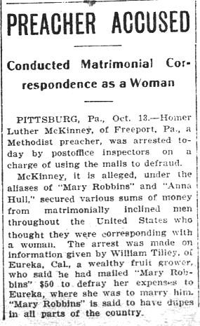 Preacher Accused of Conducting Matrimonial Correspondence as a Woman. Published in The Saint Paul Globe. Saint Paul, Minnesota. 14 October, 1904.