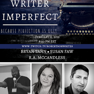 Such a talented writer, shame about the face!Who: You!What: Writer Imperfect with Joshua Robertson, Bryan Tann, Susan Faw, and YOURS TRULY R.A. McCandlessWhen: February 11, 2019 at 8:00 PM EST / 5:00 PM PSTWhere: twitch.tv/robertsonwrites