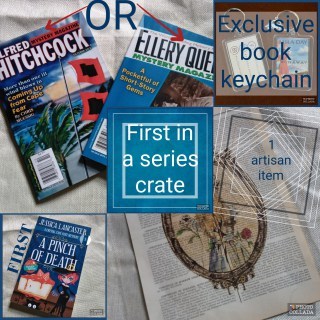 It is a cozy mystery subscription box with a new release cozy mystery paperback book, 4 homemade/handmade artisan items from small US-based businesses, exclusive author content and exclusive discounts. First in a Series box is the first book in a cozy mystery series, either an Alfred Hitchcock or Ellery Queen magazine, an exclusive keychain, and 1 artisan item.