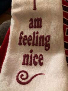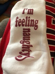 I love getting these socks. They are comfortable and thick but yet they are cute for someone to read. The are of course white and red for the Christmas season. They are easy for people to relate to you can let your feet do the talking for you.