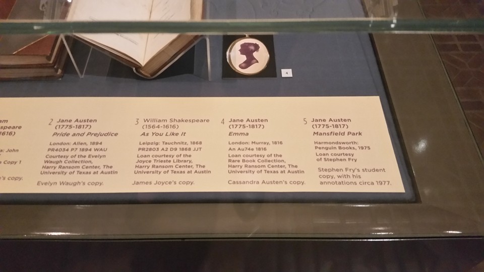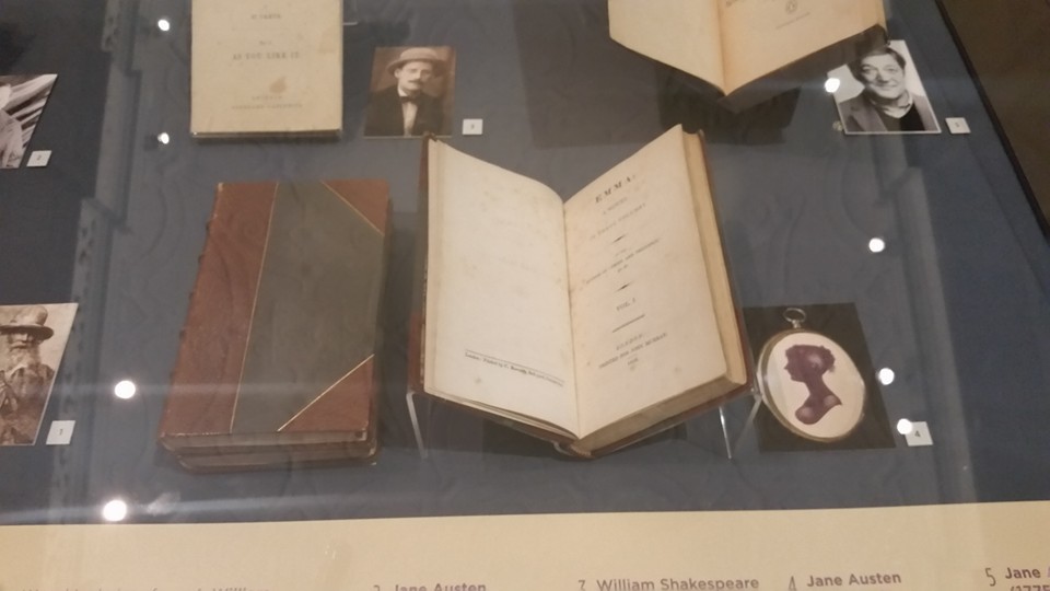 Evelyn Waugh's gilded copy of Jane Austen's Pride and Prejudice, James Joyce's coffee stained copy of William Shakespeare's comedy As You Like It, and Stephen Fry's battered paperback copy of Jane Austen's Mansfield Park.