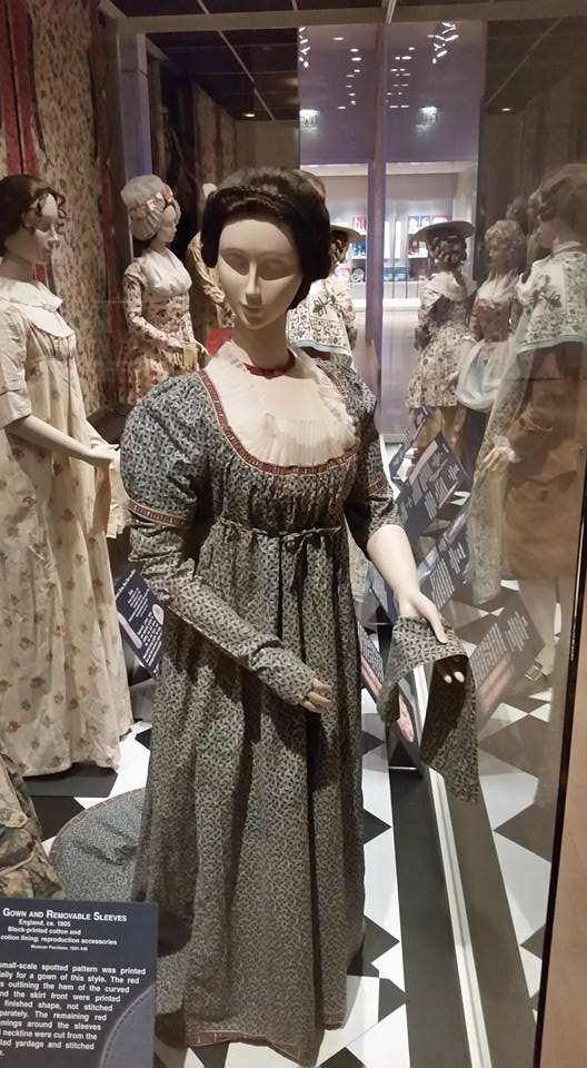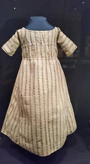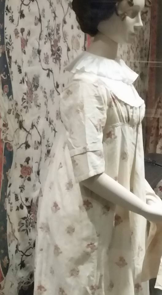 Gown c. 1800-1810. This is a beautiful example of the Empire style fashions. The fabric dates from c. 1790 suggesting that the dress was remodeled after the 1790s to reflect the changing fashions.
