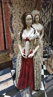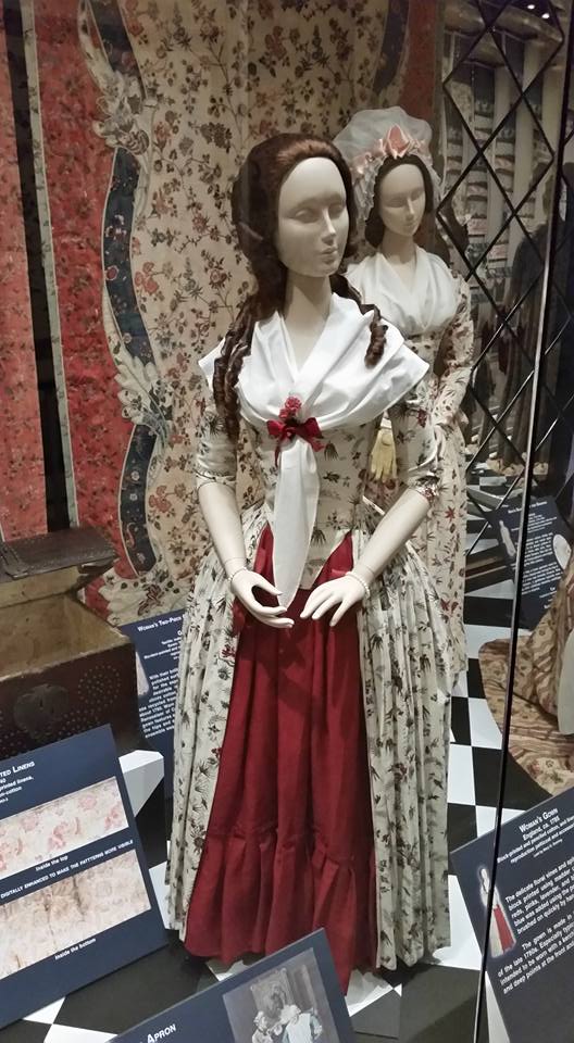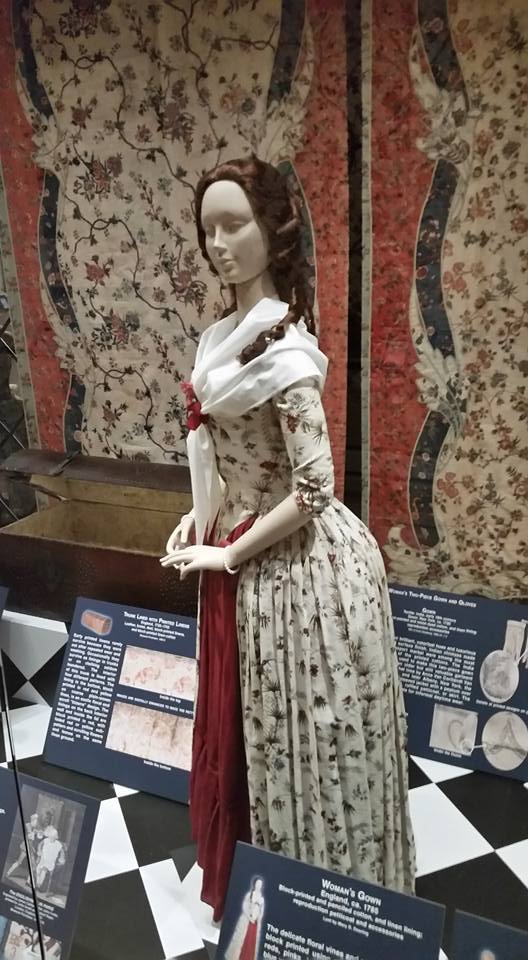 Reproduction gown in the Dewitt Wallace Decorative Arts Museum gift shop. This fabric was reproduced by Colonial Williamsburg, but has been retired. You think they would have waited till after the exhibit!