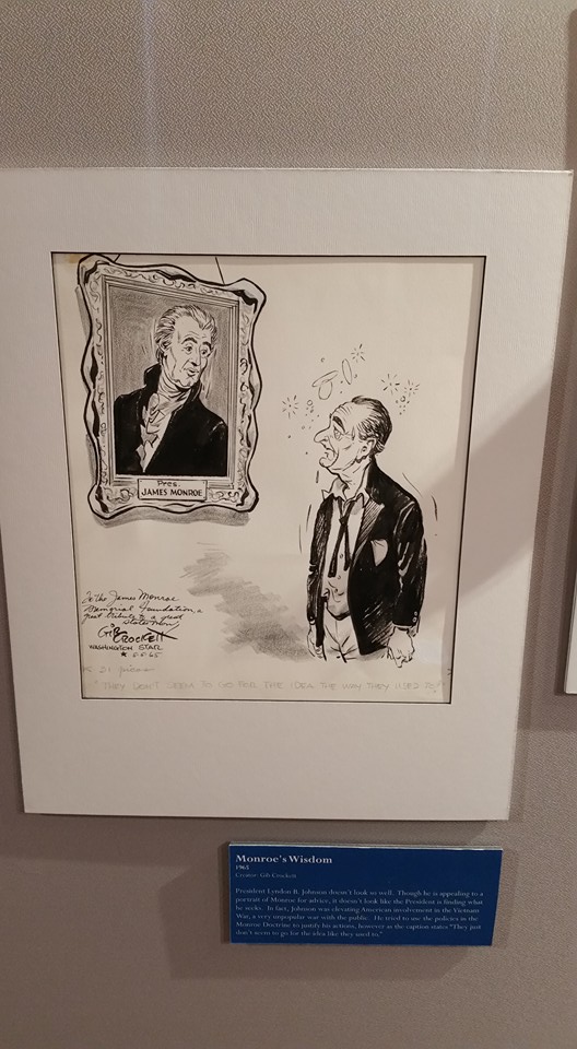 Laurence Hoes was able to acquire numerous original political cartoons from the collection of the Washington Post, including this cartoon from 1965 titled "Monroe's Wisdom," featuring an embattled LBJ seeking advice from the portrait of James Monroe over LBJ's decision to escalate military involvement in Vietnam. LBJ tried to justify his policy in Vietnam by citing the Monroe doctrine. Unfortunately, the American public was not buying it as the caption reads, "They just don't seem to go for the idea like they used to."