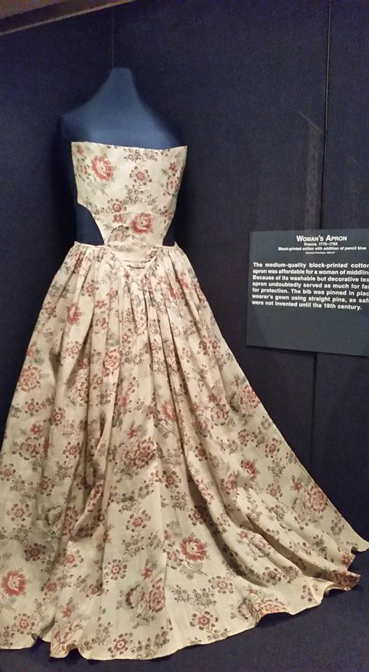 Gown and apron c. 1780-1790. This is a very fashionable gown and highlights the fashionable silhouette of the 1780s. My favorite part about this dress is that at the front of the bodice an extra strip of fabric was added across the top for modesty. I also liked how the apron is tucked under the V at the front of the waist.