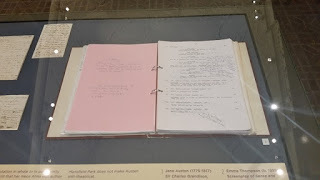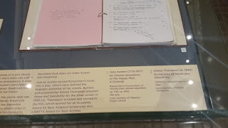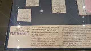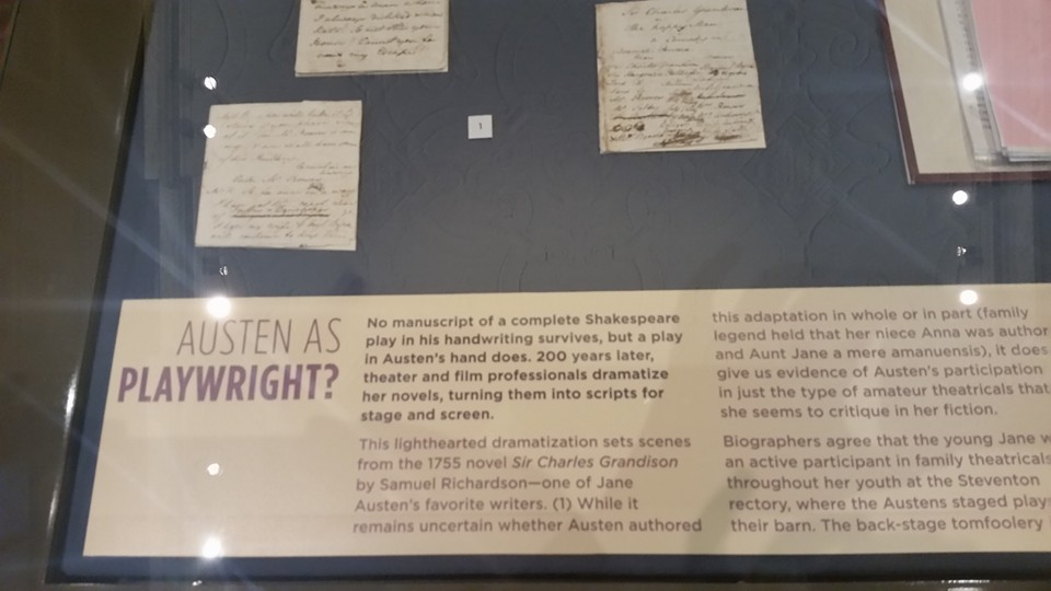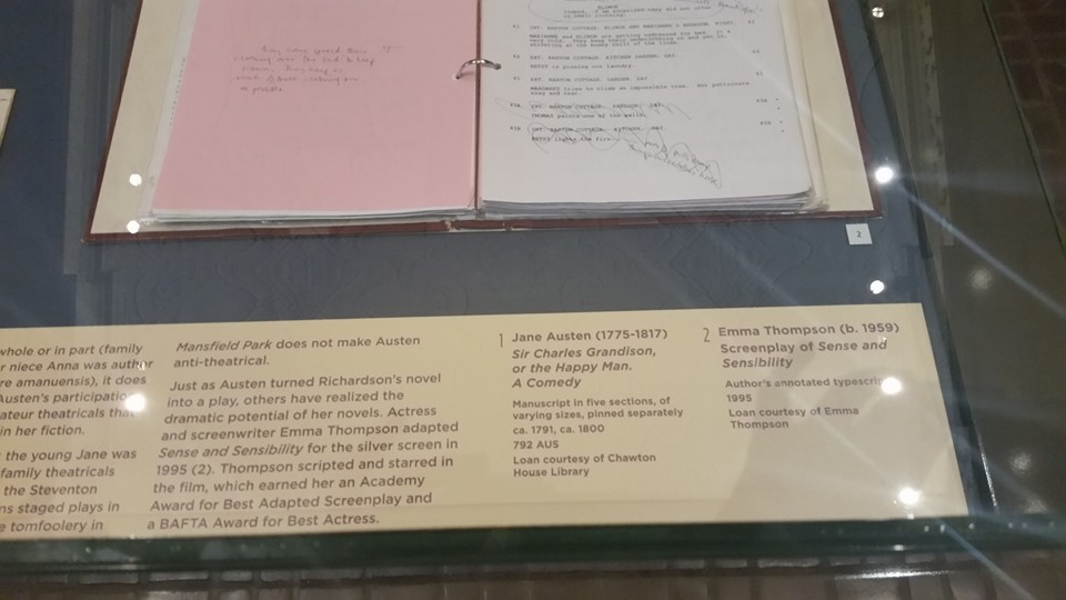 The exhibit colludes with an examination of Jane Austen's love of the theater, Handwritten script of Sir Charles Grandison testified to the Austen's family love of amateur theatricals. Jane Austen's script is displayed next to actress Emma Thompson's script from the 1995 movie Sense and Sensibility.