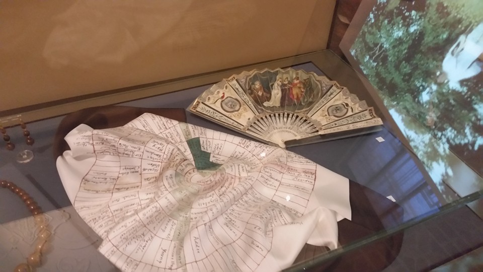 Not content with just reading the works of William Shakespeare and Jane Austen, fans have crafted items with the authors and their characters on clothing, jewelry, and accessories. This case featured a wooden jewelry set carved from a tree mentioned in The Merry Wives of Windsor from the 19th-century, a silk scarf with Jane Austen's family tree, and an 18th-century silk fan depicting the wedding scene from Henry V.