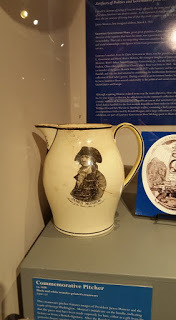 One of my favorite artifacts is this commemorative pitcher made in 1820 and presented to James Monroe. On the front is a poorly executed portrait of James Monroe and on the back is an idealized image of George Washington's tomb. The creamware pitcher was made in England!