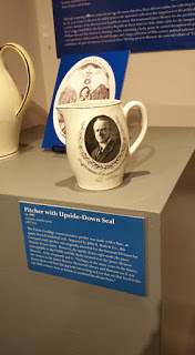 This pitcher was made to commemorate President Calvin Coolidge, but there is a major flaw: the Presidential seal was printed upside down! Imported from Liverpool by John H. Roth & Co. it was donated to the James Monroe Museum. "Perhaps, in the many years in the future, the visitors to the James Monroe Memorial Library and Museum [as it was then known] will find the jug both interesting and see that we lived in the late 20th century were as human as mankind has always been," Mr. Roth wrote.