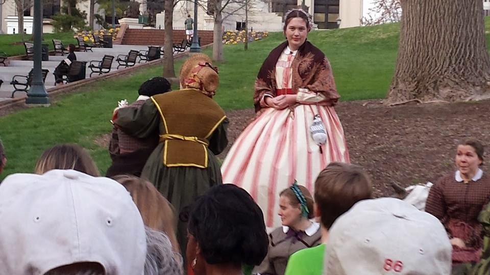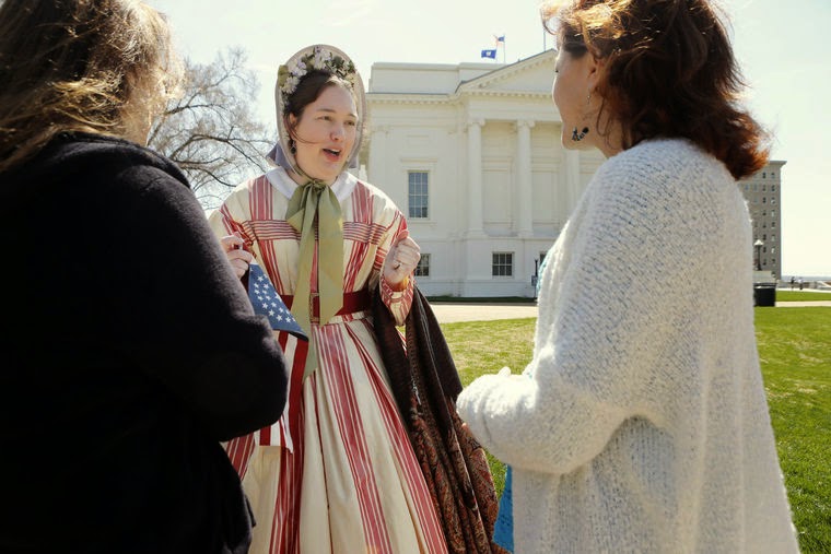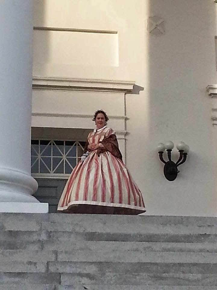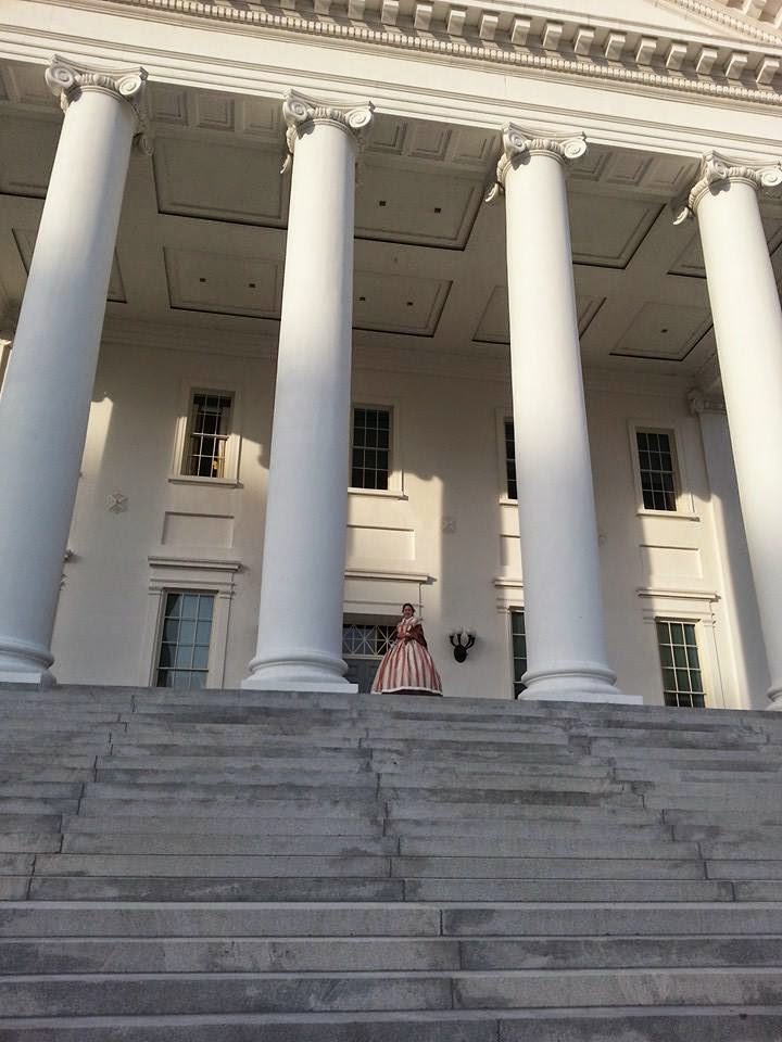 I was so thrilled to be wearing a new dress for the event. Since Elizabeth Van Lew came from a wealthy family, I decided to wear a silk taffeta dress, also I wanted to look my best for the arrival of the Union Army. (Photograph courtesy of Lynn Hamilton)For the first day I was placed in Capitol Square in front of the Virginia State Capitol, a gorgeous location. It was no longer 2015, but April 2, 1865, and Confederate President Jefferson Davis had just received a note from General Robert E. Lee while sitting in his pew at St. Paul's Episcopal Church that the Army of Northern Virginia could no longer hold onto Petersburg, VA and that the army was now in retreat leaving Richmond vulnerable. Realizing that the Confederacy could no longer hold onto the Confederate capital, Davis and the Confederate government evacuated the city. I was accompanied with Rebecca Turner who played an Irish factory worker and Marc Ramsey who played an Confederate officer. Capitol Square is a gorgeous location with lovely gardens, a beautiful water fountain, and the historic Virginia Washington Monument. I would address visitors passing by, informing them that I was very excited that the Confederate government was evacuating, how I hated the Confederacy and slavery, and how I helped operate a spy ring in Richmond. The response from the public was amazing, many were excited to engage in a first person conversation and would talk with me for several minutes. I expected a few people to be pro-Confederate and against "my" position and activities. Surprisingly, practically everyone I encountered at this site voiced their approval and admiration. Comments about how "brave I was" and a few "God bless you" where the typically response. I was even interviewed by the Richmond Times-Dispatch, though for the interview I did break out of character for the moment.