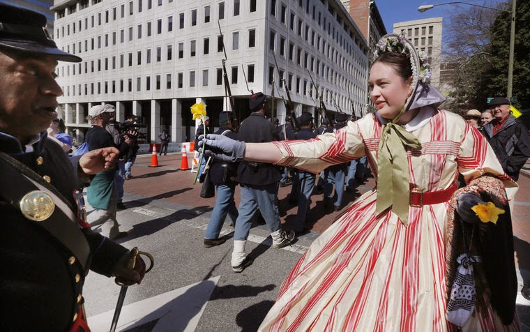 Another image outside the White House of the Confederacy with Adrienne Roberston. (Photo courtesy of Charles LeCount)On Saturday, the last day of the commemoration I returned to the Capitol Square where a procession of USCT's commemorated the arrival of Union troops on April 3, 1865. Naturally, as a Unionist I was overjoyed to see Union soldiers marching down the streets of Richmond and brought flowers to give to the soldiers. Following the procession, there was a ceremony on the steps of the capitol commemorating the 150th anniversary of Emancipation in Richmond. The event concluded with an afternoon of living history, speakers, and historic displays.