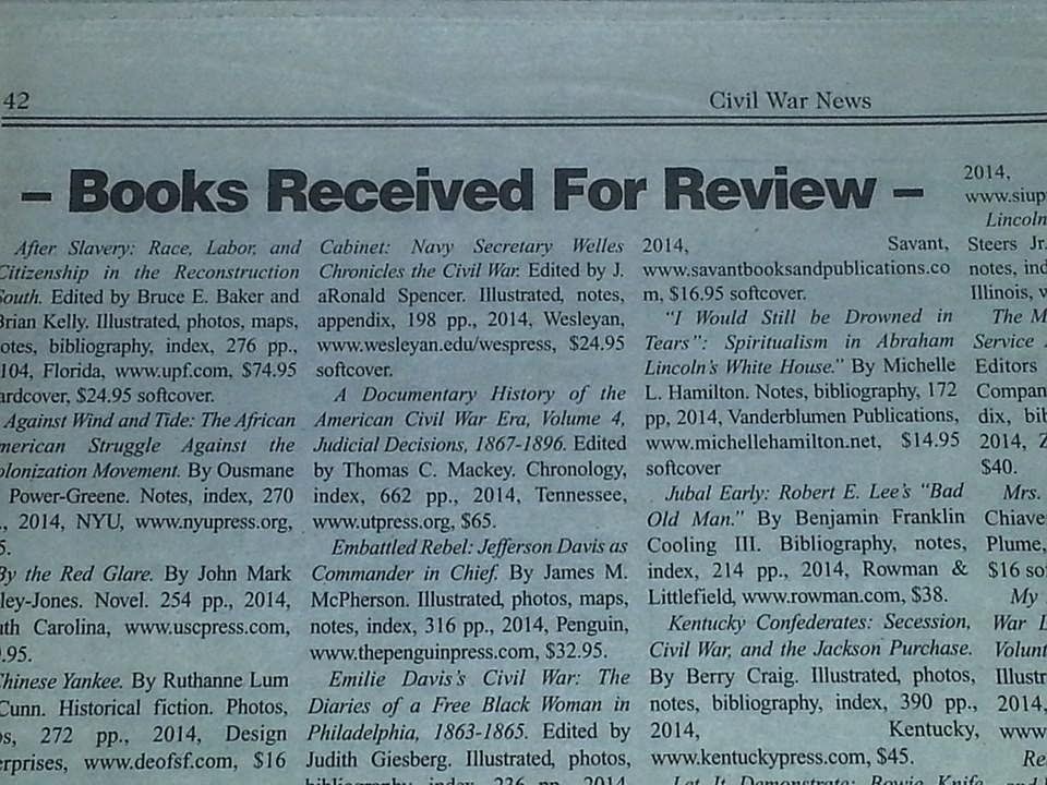 The November issue of Civil War News has been published, the issue features the annual massive Civil War Book section. I submitted my book in for review, while sadly it did not get selected for review, it was featured in the "Books Received For Review" column on page 42, so at least that is something!