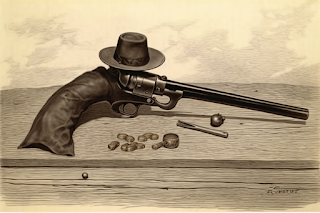 Alumise pildi autor on samuti MidJourney, kes arvas, et laua taga istuv kaabuga mees ja laual lebav revolver peaks pildil välja nägema kuidagi niimoodi.
