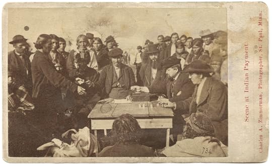 Scene at Indian Payment likely photographed at Odanah around the year 1870. MNHS Collections.