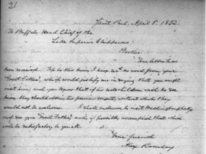 Letter by William Johnston to George Manypenny, October 20, 1855. MNHS Manuscript Collections.In October 1855, trader and government interpreter William Johnston wrote a letter to the Commissioner of Indian Affairs, George Manypenny in which he stated, “Since the money payments have commenced to the Indians, the present Indian traders are not human; they grasp and cheat him of his all and mock at his degradation and silent despair.” Johnston went on to name the traders Charles Borup, Charles Oakes, Clement Beaulieu, and George Nettleton among those who took advantage of the Indian annuities. He also accused Indian Agent John Watrous of exploiting the system illegally for his own personal profit (Johnston to Manypenny, October 20, 1855).
