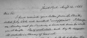 Letter from Alexander Ramsey to John Watrous, August 14, 1851; Found in the Manuscript Collections of the Minnesota Historical Society.After learning about the tragedy, Ramsey was undeterred in his removal efforts. Speaking to the Minnesota Legislative Assembly in January 1851, Ramsey reiterated his plans for removal and suggested they would begin again in the spring. A few weeks later, while meeting with the La Pointe Indian Agent John Watrous, the two men discussed their plans to continue the removal efforts beginning on May 1st when the Ojibwe sugar making would be over. In the following months, the Lake Superior put up a strong resistance to removal and were determined not to return to Sandy Lake. Nonetheless, Ramsey insisted that they be removed and that their payment be made in Minnesota Territory. Writing to Watrous on August 14, 1851, Ramsey encouraged Watrous against the resistance stating, “Be of good cheer, and try to conquer all obstacles in the way of removal” (White, The Regional Context, 225).