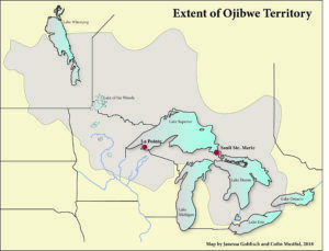 “The Ojibways are scattered over, and occupy a large extent of country comprising all that portion of the State of Michigan lying north of Green Bay and west of the Straits of Michilimackinac, bordering on Lake Superior, the northern half of Wisconsin and the northeastern half of Minnesota Territory. Besides this they occupy the country lying from the Lake of the Woods, over the entire north coast of Lake Superior, to the falls of St. Mary’s and extending even east of this point into Upper Canada. They literally girdle the great “Father of Lakes,” and the largest body of fresh water in the world may emphatically be called their own, Kechegumme, or “Great Water”” (Warren, History of the Ojibway, 37).