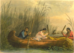 “Gathering Wild Rice” by Seth Eastman. From “American Aboriginal Portfolio” by Mary Eastman and held by the Newberry Library of Chicago.Fall Ricing: Long ago, while the Ojibwe people were living near the Atlantic Ocean, they were told by their prophets to travel west “where the food grows on water.” After many years migration, they found that land. The food they discovered growing on water was wild rice. In the fall, the Ojibwe gathered and processed wild rice for use during the long winter. Wild rice grows in shallow water near the shores of lakes and bays. In order to gather the rice, the Ojibwe used a canoe that one person pushed slowly through the rice stalks, while another used knocking sticks to shake the rice off the stalks and into the canoe. Once ashore, the Ojibwe processed the rice by drying it, roasting it, and then separating the hull from the kernels. During times of abundance, most families could process hundreds of pounds of rice every fall.