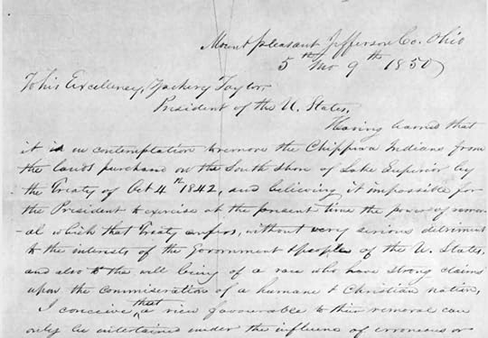 Journey of the La Pointe Delegation to Washington in 1852.Another petition among numerous others, was written by the La Pointe Ojibwe and carried with them as they traveled to Washington in 1852. As the delegation traveled by canoe across Lake Superior, they stopped at the mining and trading communities of Ontonagon, Portage Lake, Houghton, Hancock, and Sault Ste. Marie. There they obtained signatures for their petition from businessmen, traders, and miners who were sympathetic to their cause. Once they arrived in Washington, the petition was personally delivered to President Millard Fillmore who recognized several of the signatures. According to the memoir of Benjamin Armstrong, an interpreter who traveled with the delegation, after meeting the Ojibwe and seeing their petition, Fillmore agreed to countermand the removal order and reinstate annuity payments at La Pointe, which is exactly what the Ojibwe had worked so hard to achieve.
