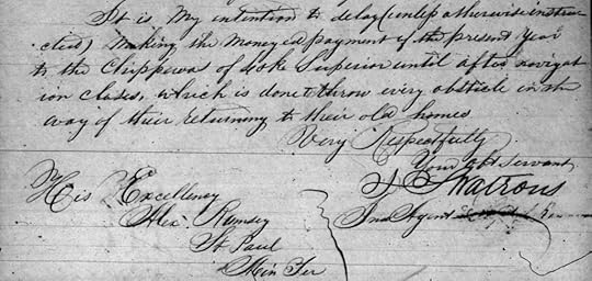 In this letter by John Watrous to Alexander Ramsey, Sept. 22, 1851, Watrous states, “It is my intention to delay (unless otherwise instructed) making the moneyed payment of the present year to the Chippewas of Lake Superior until after navigation closes, which is done to throw every obstacle in the way of their returning to their old homes.” Letter found in the MNHS Manuscript Collections.In addition to continuing his plan, Watrous also argued that removal of the Lake Superior Ojibwe had already been accomplished and therefore there was no action to suspend. In his annual report written September 20, 1851, Watrous stated that, “it affords me much satisfaction to inform Your Excellency that the entire removal has been accomplished” (White, The Removal Context, 213). Watrous went on to report that 3,000 Ojibwe had been removed in 1851 when in reality only a few hundred had removed.