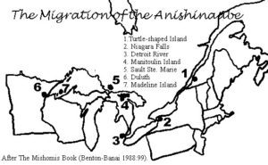 Ojibwe Migration from The Mishomis Book by Eddie Benton BanaiThe Ojibwe split into two groups—one settling along the northern shore of Lake Superior and one settling along the southern shore. Those who migrated along the southern shore finally settled at Moningwunakauning, the place of the golden-breasted woodpecker. Today, this place is called La Pointe, or Madeline Island. Here the Ojibwe found Manomin (Wild Rice) growing on the waters in Chequamegon Bay. It was the place the creator had foretold—the place where food grows on water.