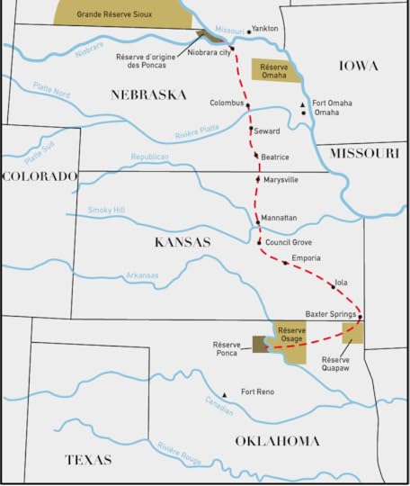 Route of the deportation of Standing Bear and the Ponca tribe in 1877. Map from Wikimedia Commons – https://commons.wikimedia.org/wiki/File:Trajet-ponca.pngWhen the Ponca leaders finally made it back to their reservation, they were met by Special Agent Kemble who told them that he had orders to remove them to Indian Territory—by force if necessary. A small contingent of Ponca, about 170 of their citizens, agreed to go voluntarily and left for Indian Territory on April 16, 1877. The remainder, about 500 Ponca citizens, remained on their Nebraska reservation until General William Tecumseh Sherman ordered two companies of American soldiers to Ponca territory to force their compliance. The Ponca, led by White Eagle and Standing Bear, departed their reservation on May 16, 1877. The 600 mile, 54-day journey south was plagued by poor weather conditions and resulted in the death of nine Poncas, including Standing Bear’s daughter, Prairie Flower, who died of consumption and was buried at Milford, Nebraska.