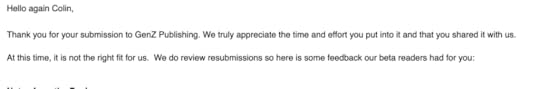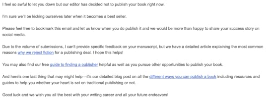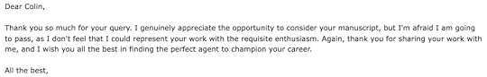 Submission Process – In September and October, using the list of agents provided by Readerly, I began submitting my manuscript for literary representation. Also, in November I began submitting directly to a handful of small presses. So far, I’ve submitted my manuscript to twenty-one agents and eleven publishers. Of those, I’ve received nine agent rejections and five publisher rejections. I’m still waiting to hear back from the rest. At the end of this blog post, I’ve shared screenshots of the rejections letters. They are discouraging, of course, but they are also part of the process.
