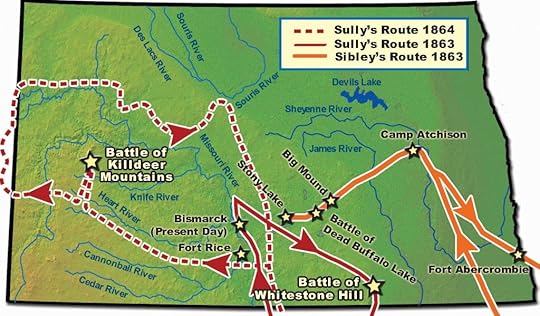 A map of the 1863-64 military campaigns against the Sioux by Sully and Sibley. Map source: