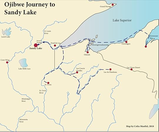 The journey of the Ojibwe from their homes near Lake Superior to Sandy Lake in 1850. Two years later, they were asked to travel to Crow Wing on the Mississippi River. Because the Lake Superior Ojibwe were not there to receive the goods and monies promised them in their treaty, Agent Watrous stored their annuities in an agency building at Crow Wing. Learning their goods awaited them, a group of Lake Superior Ojibwe made the long trek to Crow Wing in early 1852 to collect their belongings. However, when they arrived, they found that an arsonist had burned down the building, destroying everything inside.