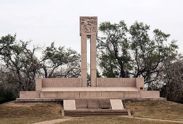 Though Goliad was one of the seminal events of the Texas Revolution, more than 100 years would pass before the State of Texas erected a monument to the men who died. In 1936, as part of the Texas Centennial celebration, the state earmarked funds for a memorial. The monument was built over the mass grave of Fannin and his men, and dedicated in 1938. The pink granite marker, inscribed with the names of the executed Texians and their comrades who died during the Battle of Coleto, bears the sculpted image of the Goddess of Liberty lifting a fallen soldier in chains.