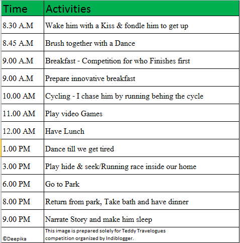 Evening Sharp 6.00, I have to take him to Park. I have to help him and the other kids in spinning the merry-go-round. The kids playing on it are so energetic and their happy and positive mood spreads to me. I play teeter-totter with him, when he doesn't get a company. The toughest part comes when I need to vacate the park. He goes to the slide and says, "I will come home only after 15 slides."I patiently wait counting and watch him playing. I willingly count wrong as to watch him enjoying his slide for more time.