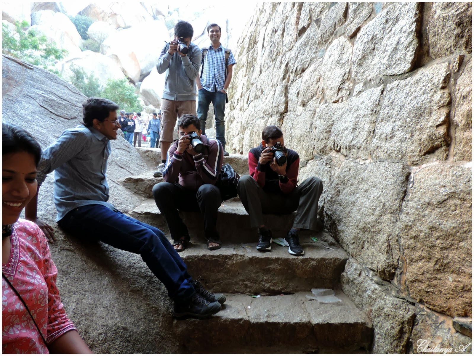 Our professional photographers trying to capture(in memory card) the enemiesAll adventure lovers squeezed through crevice and Shruthi was standing beside the crevice and hit everyone who popped up their head with Camera Bag. It was little challenging, and few took the other route to come out instead of crevice.