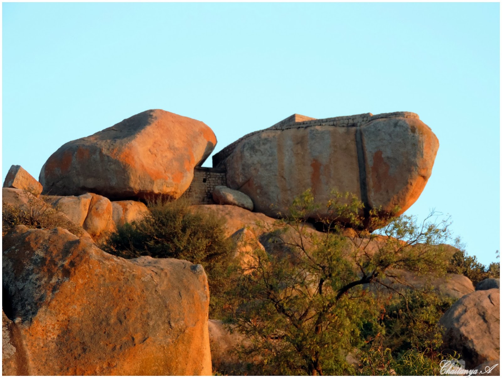 We got up well before the sunrise, hired a Guide and started to explore the fort. The Fort welcomed us by treating with a bright Sunrise over the hills, strewn with windmills. The guide started reciting in English, Kanada and Hindi. Apart from him, none understood his English and Hindi narration. So, we requested him to stick to Kanada and appointed Shruthi and Ashwin as translator.Below are the few attractions from Chitra durga Fort: