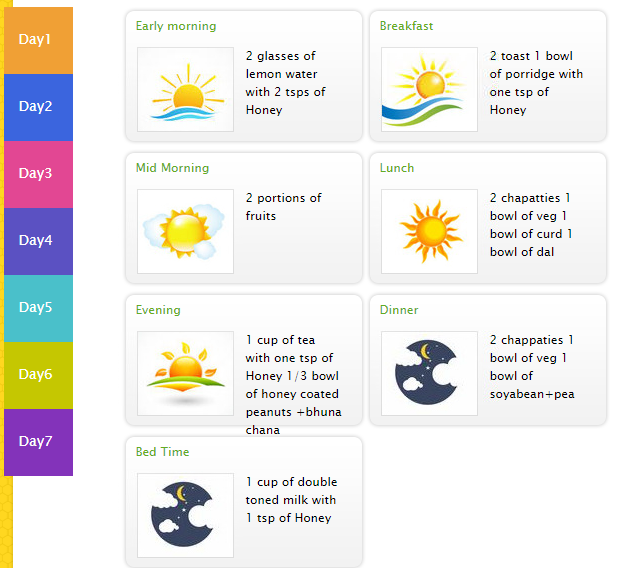 Honey Diet - As soon as you wake up in the morning, the first and the best thing to kick start your engine or metabolism is to drink one glass of water along with honey. Research says that this is one of the best techniques for weight management as well as best way to start your day.Divide your meals into 6 smaller portions - These helps in not only eating nutritious food but also helps you from not starving.Replace Sugar with Dabur Honey - Sugar is the best enemy for metabolism. Consuming Sugar will affect the metabolism and it’s a bad agent for burning the calories. In fact it burns glucose rather than burning the fat.Recently I came across the Dabur honey website and in just 3 clicks; you can get the diet planner Dabur honey.Still have quires, You can check with an Expert or Dietitian here - http://www.daburhoney.com/login.aspx