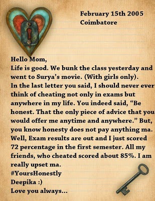 In the last letter you said, I should never ever think of cheating not only in exams but anywhere in my life. You indeed said, “Be honest. That the only piece of advice that you would offer me anytime and anywhere.” But, you know honesty does not pay anything ma. Well, Exam results are out and I just scored 72 percentage in the first semester. All my friends, who cheated scored about 85%. I am really upset ma.