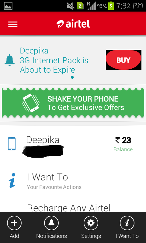 The Airtel app offers "I want to feature", where I have an option to buy DSL smart byte, top-up my mobile and recharge my friend’s pre-paid mobile in just one go. With this feature, I can easily access the information that I am looking and it’s indeed reduces the search time that I spend in my PC.
